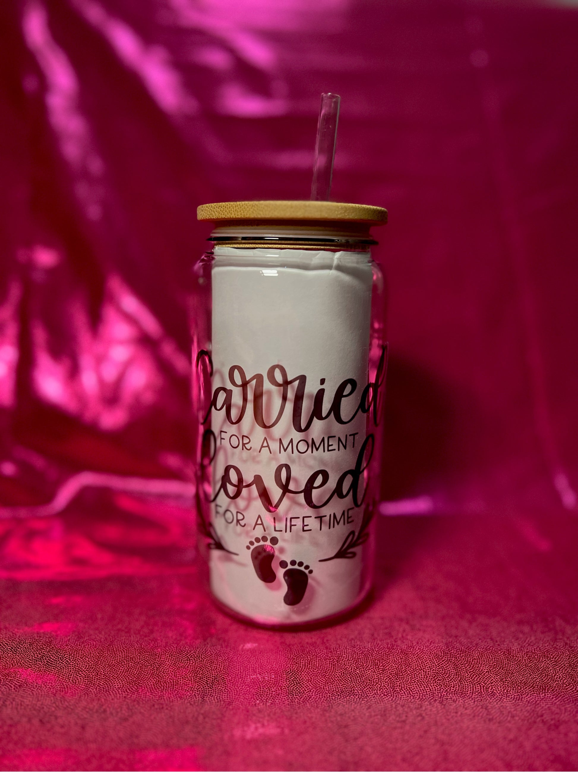 This beautiful glass cup is a tribute to the eternal bond between a mother and her angel baby. The cup features the heartwarming message "Carried for a moment. Loved for a lifetime," reminding us that the love between a mother and her child lasts forever. With its sturdy build and elegant design, this cup is perfect for savoring cold & warm drinks, and serves as a comforting reminder of the precious memories shared with our loved ones. Cherish the memory of your angel baby with this special cup that symbolizes the enduring strength and beauty of a mother's love.